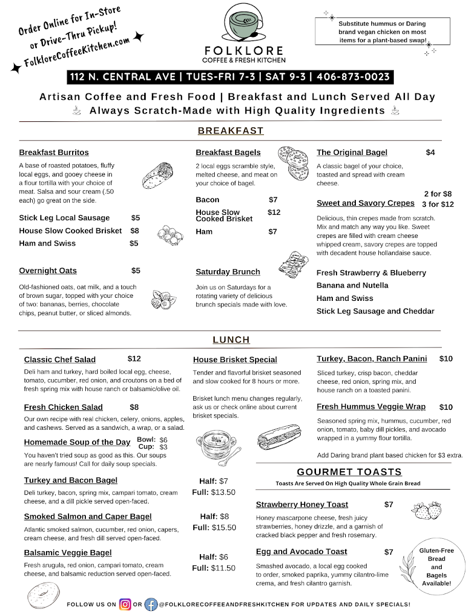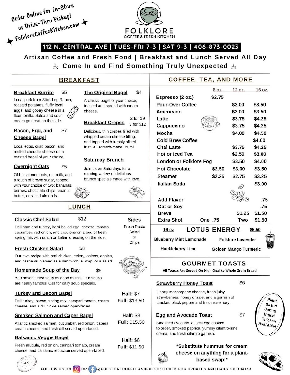 Folklore Coffee & Fresh Kitchen offers a delightful variety of options for both breakfast and lunch, perfect for any time of the day. For lunch, you can enjoy the Smoked Salmon and Caper Bagel, a flavorful choice with the richness of smoked salmon, or the Turkey and Bacon Bagel, which combines savory turkey and crispy bacon. The Balsamic Veggie Bagel is a great option for vegetarians, featuring a tangy balsamic glaze paired with fresh vegetables. Sweet tooths will appreciate the Cookies 'n Cream Bagel, a unique treat blending the classic cookie flavor with the chewiness of a bagel. If you're craving something lighter, the Fresh Chicken Salad is a refreshing and healthy choice. For breakfast, the restaurant offers satisfying Breakfast Burritos filled with hearty ingredients to start your day off right, or you can opt for the Fresh Baked Pastries for something sweet and warm. The Original Bagels are a perfect classic option, whether enjoyed plain or with a spread. For beverages, Folklore serves a selection of expertly brewed coffee and tea, including Espresso, Pour-over Coffee, Americano, Latte, and Cappuccino, all designed to complement any meal. Whether you're stopping by for a quick breakfast or a relaxing lunch, the menu has something to satisfy every palate.